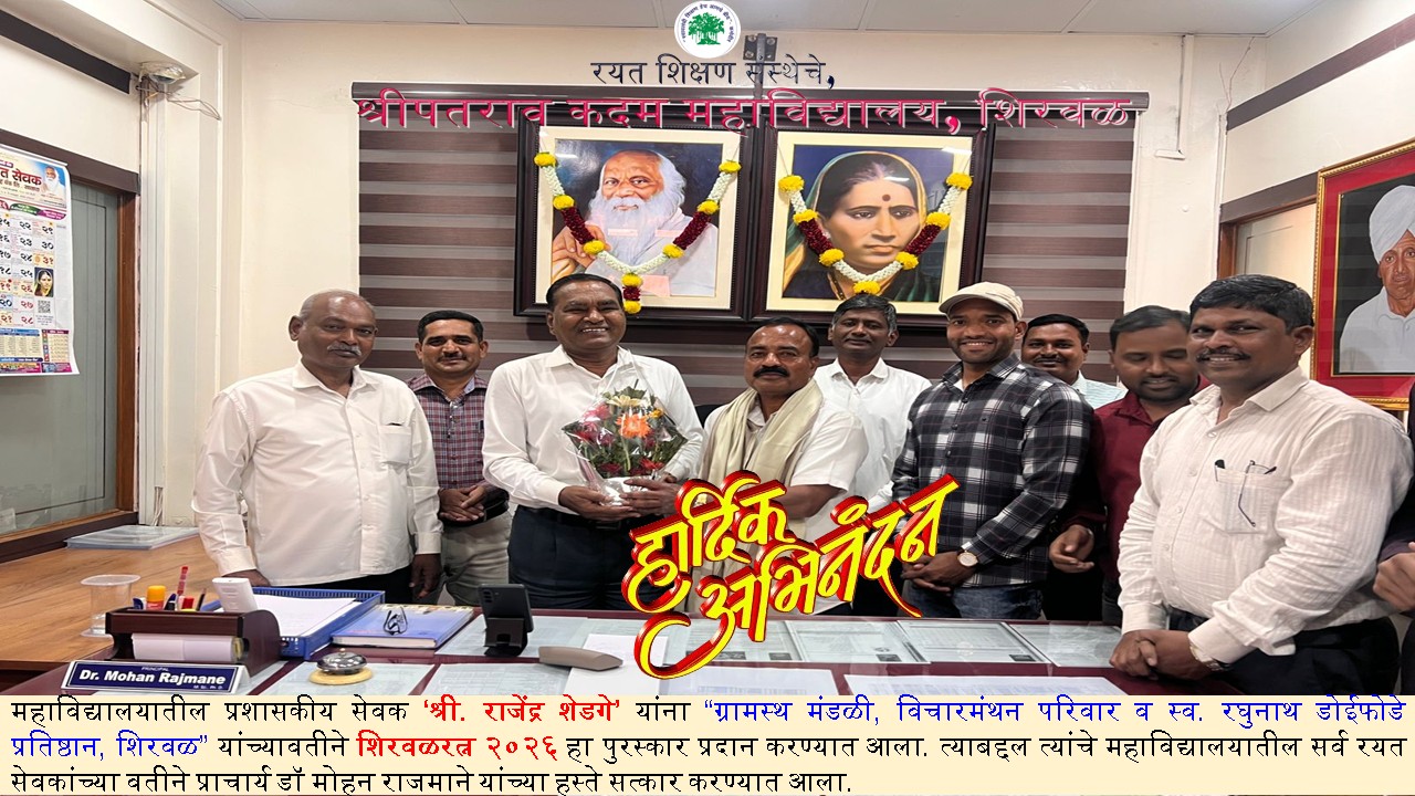 This is my great pleasure to introduce Shripatrao Kadam Mahavidyalaya, Shirwal is one of the constituent institutes of the Rayat Shikshan Sanstha. Rayat Shikshan Sanstha was founded by Padmabhushan Dr. Karmveer Bhaurao Patil (D.Lit.) in 1919. Shripatrao Kadam Mahavidyalaya, Shirwal is established in 1983 and affiliated to Shivaji University, Kolhapur. Presently, it conducts five programmes (B.A. / B.Com. / B.C.A./ M.A./ M.Com) at UG and PG levels along with the student support services like NSS, NCC, Competitive Exams Guidance Cerner, Sport, Culture, and so on. The college has developed various statutory and non-statutory committees at the college level. Also, the college has well-qualified teaching faculties and non-teaching staff with enough equipment and well-furnished infrastructures. The college has 23 skill-based Short-Term Courses have been designed to support the conventional degree Programmes. These Short Term Courses are approved by UGC, Shivaji University, Kolhapur, NGOs, Regional Industries, and the college. The college has been rendering educational as well as social responsibilities ardently since its establishment in 1983. It emphasizes the overall improvement of the students in respect of Higher Education, Culture, and Social responsibilities and contributes to the nation’s development. Recently, the college has assessed at the 3rd Cycle and reaccredited B++ Grade with a 2.98 CGPA in the academic year 2020-2021 by NAAC, an autonomous institute of UGC.