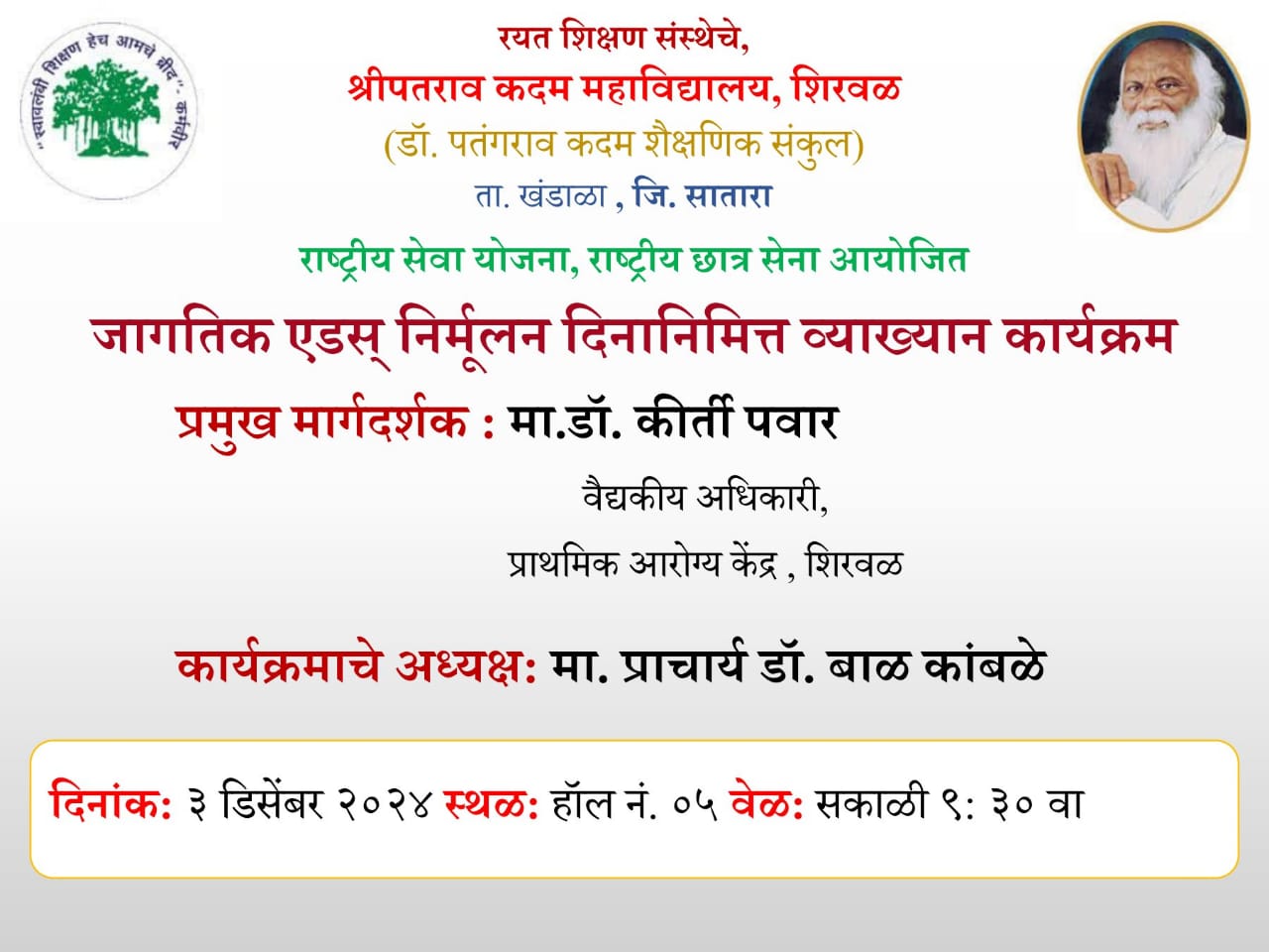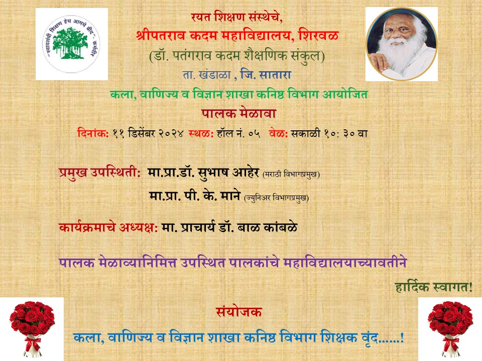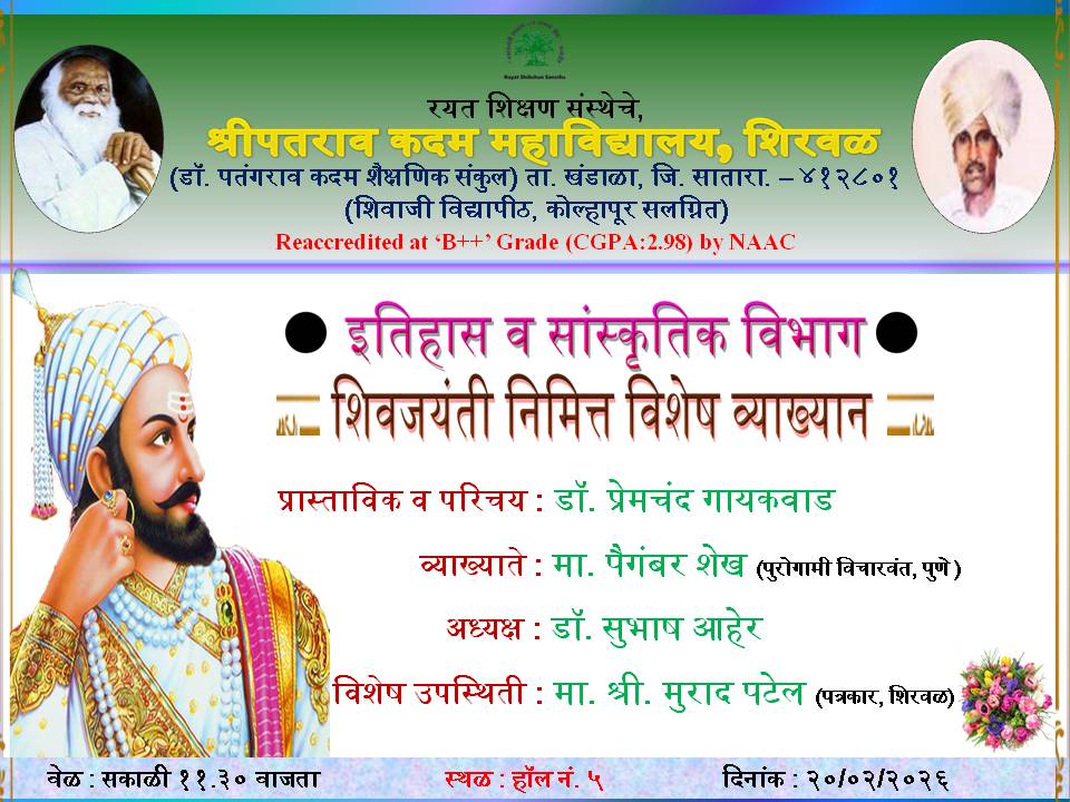 This is my great pleasure to introduce Shripatrao Kadam Mahavidyalaya, Shirwal is one of the constituent institutes of the Rayat Shikshan Sanstha. Rayat Shikshan Sanstha was founded by Padmabhushan Dr. Karmveer Bhaurao Patil (D.Lit.) in 1919. Shripatrao Kadam Mahavidyalaya, Shirwal is established in 1983 and affiliated to Shivaji University, Kolhapur. Presently, it conducts five programmes (B.A. / B.Com. / B.C.A./ M.A./ M.Com) at UG and PG levels along with the student support services like NSS, NCC, Competitive Exams Guidance Cerner, Sport, Culture, and so on. The college has developed various statutory and non-statutory committees at the college level. Also, the college has well-qualified teaching faculties and non-teaching staff with enough equipment and well-furnished infrastructures. The college has 23 skill-based Short-Term Courses have been designed to support the conventional degree Programmes. These Short Term Courses are approved by UGC, Shivaji University, Kolhapur, NGOs, Regional Industries, and the college. The college has been rendering educational as well as social responsibilities ardently since its establishment in 1983. It emphasizes the overall improvement of the students in respect of Higher Education, Culture, and Social responsibilities and contributes to the nation’s development. Recently, the college has assessed at the 3rd Cycle and reaccredited B++ Grade with a 2.98 CGPA in the academic year 2020-2021 by NAAC, an autonomous institute of UGC.